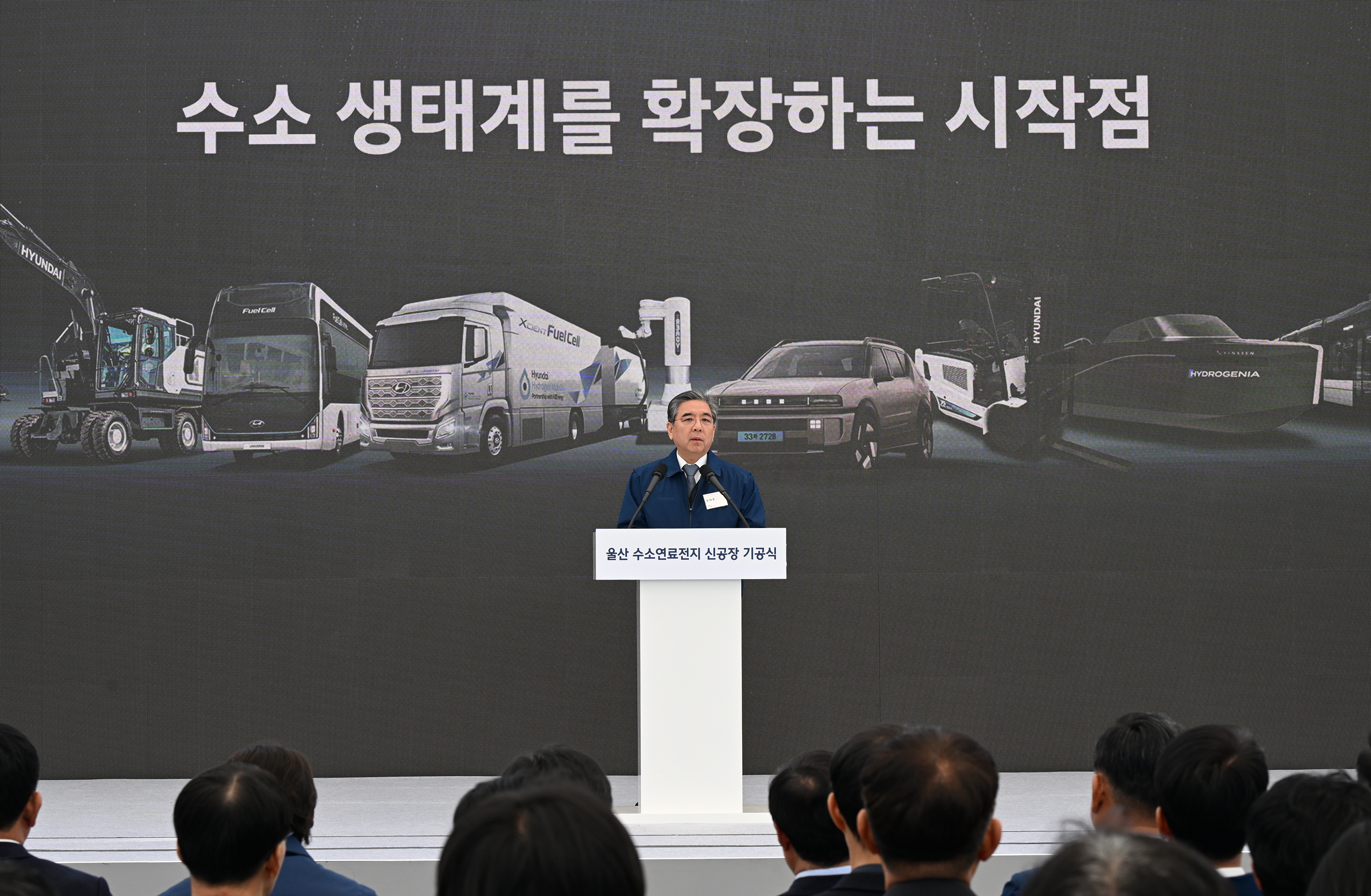 이어 주요 참석자들이 무대에 올라 터치버튼 세리머니를 진행했다. 참석자들이 연단 중앙에 마련된 터치패드의 버튼을 동시에 누르자 대형 화면에 울산 수소연료전지 신공장의 조감도가 펼쳐지며 공장 건립의 본격적인 출발을 알렸다.